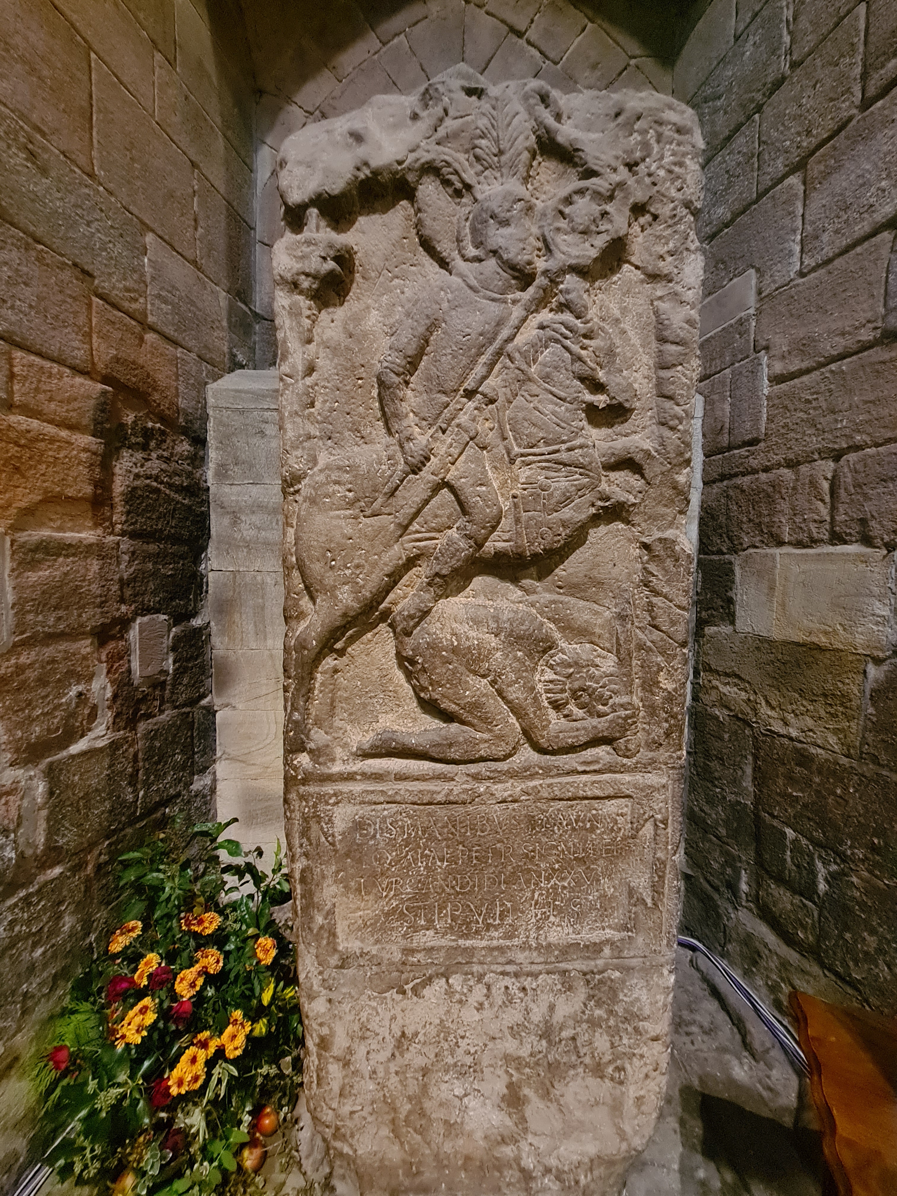Whether the helmet and skull are really Fenwick’s is uncertain, but the helmet dates from 1460, with remodelling in the 17th century, which fits with the tradition of it being the helmet worn by the Duke of Somerset at the Battle of Hexham in 1464 and later worn by John Fenwick at Marston Moor.Resistance to authority was not the exclusive preserve of the Reivers. When the Augustinian Priory at Hexham Abbey was due to be closed at the Dissolution of the monasteries, the canons barricaded themselves in for a couple of months.  The Abbey has a long history, having originally been founded in the seventh century as a Benedictine monastery by St Wilfred. Little remains of Wilfred’s church except the crypt, rediscovered in 1725, which can be visited on request, but there is plenty of interest, including Roman, Saxon and Viking stones, and ancient bishop’s throne and 14th century tomb effigies.